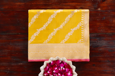 Handcrafted To Perfection! This Is A Classic Kadhua Gulab Jangla Banarasi Saree Ornamented With Beautiful Gulab Motifs And Scrolling Zari Vines Set...