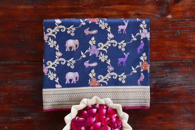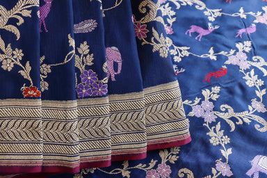 Indulge In Opulence With Our Navy Blue Chinar Pure Silk Handloom Banarasi Jangla Saree. Handwoven With Exquisite Kadhua And Jangla Designs, This Sa...