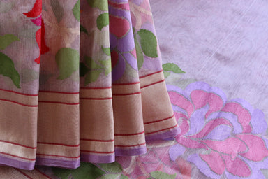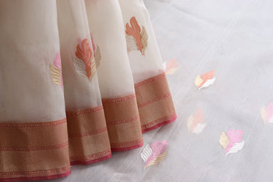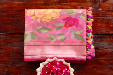Showcasing This Delicate Handloom Saree Made In Sheer Kora Silken Base With A Gorgeous & Colourful Floral Skirt Border Crafted In Pauri Weave E...