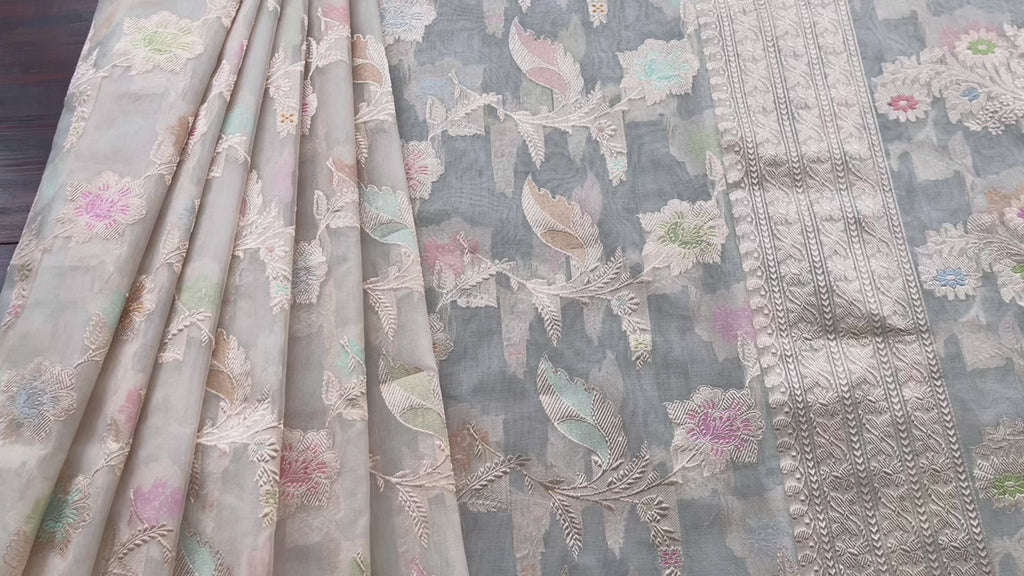 Festive, Rich And Artful! Such Is Our Exquisite Organza Jangla Handloom Banarasi Saree. Adorned With A Mesmerizing Floral Jaal Throughout Set Against An Intricate Zari Border And Elaborate Meenadar Aanchal.