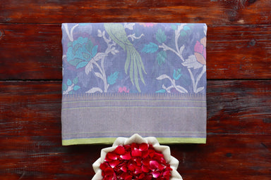 This Grey Pure Zari Cotton Handwoven Banarasi Saree Showcases Exquisite Craftsmanship With Its Delicate Bird Motif, Embodying Timeless Elegance. Th...