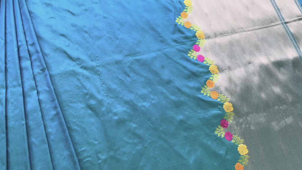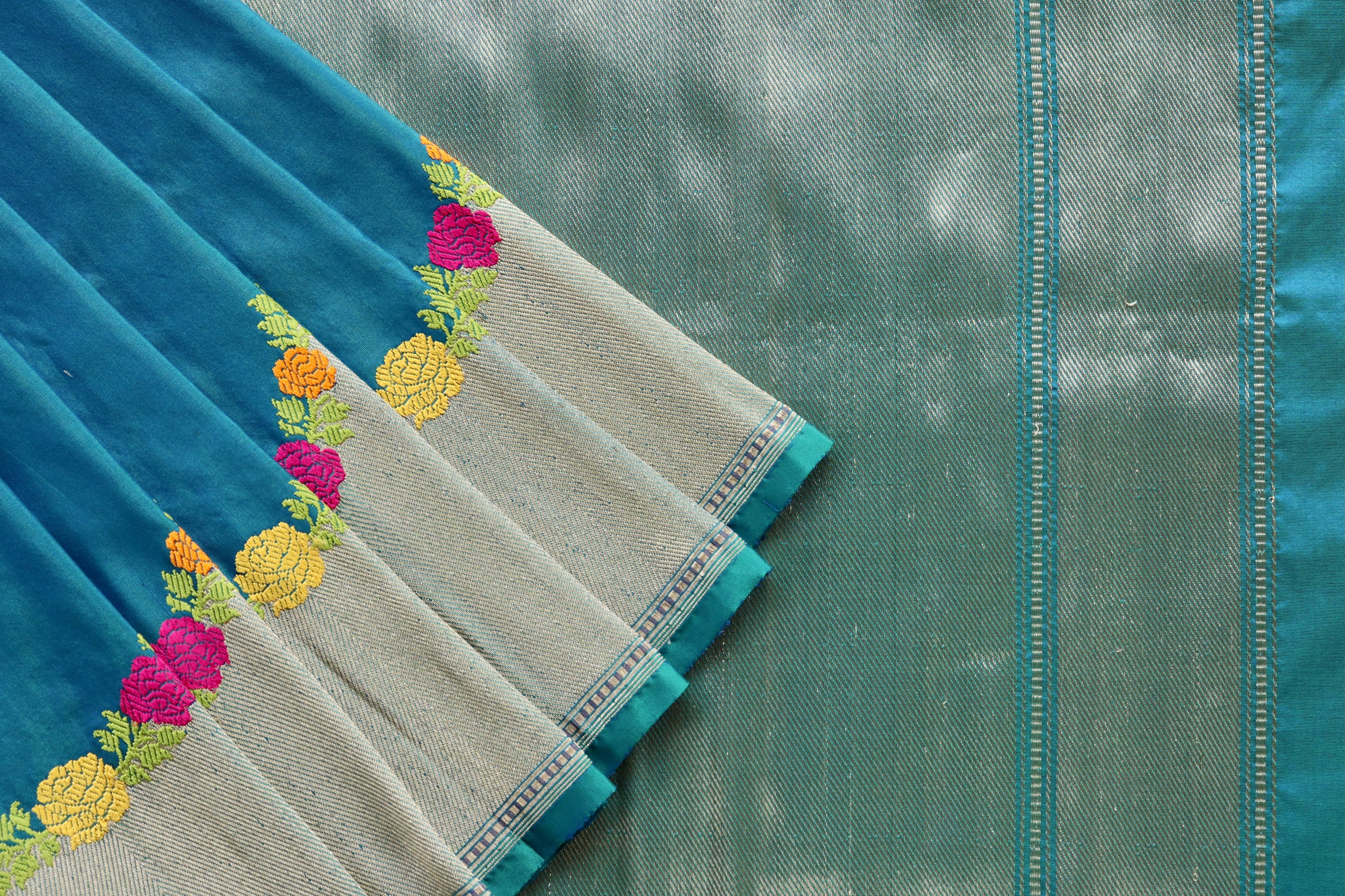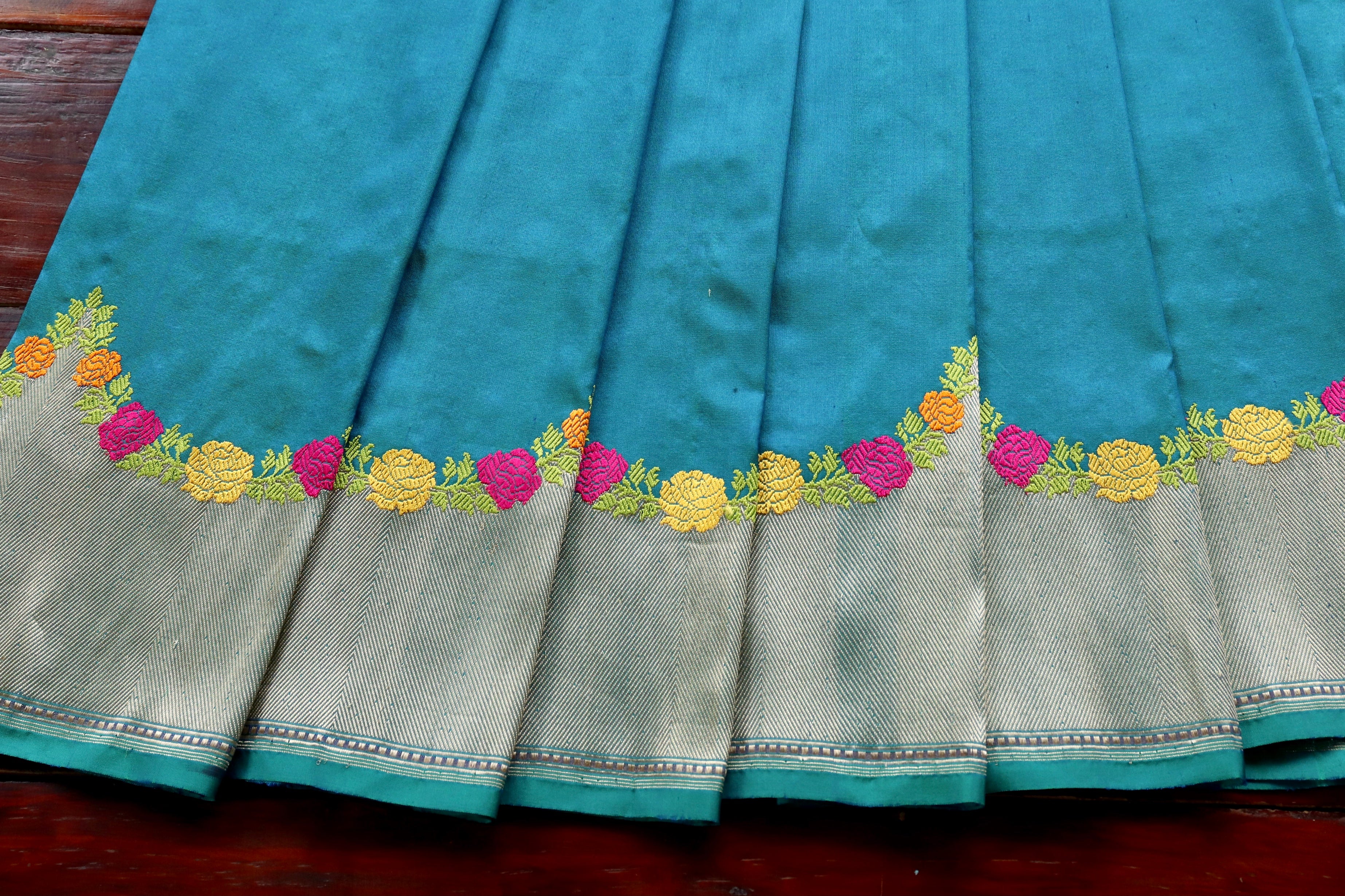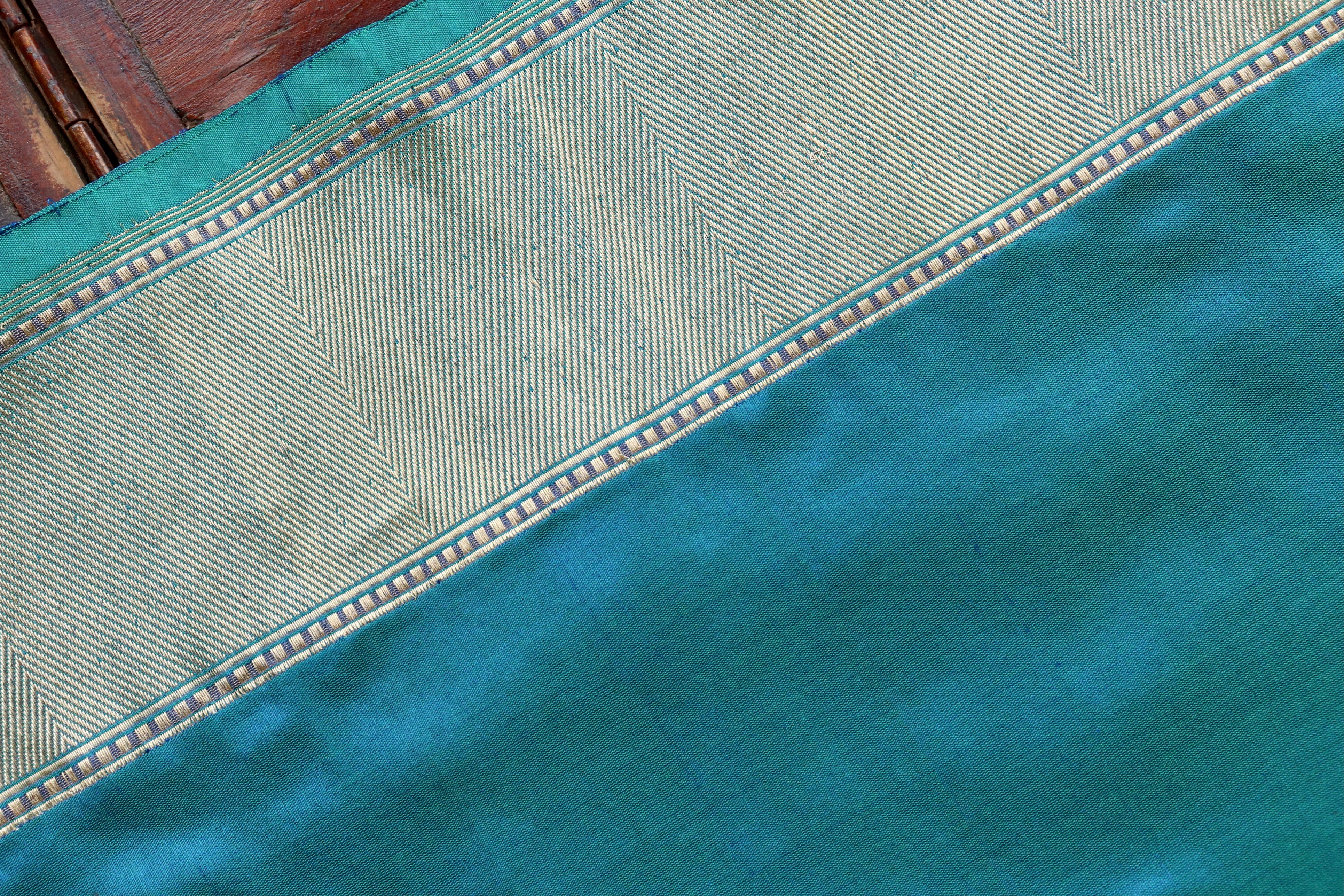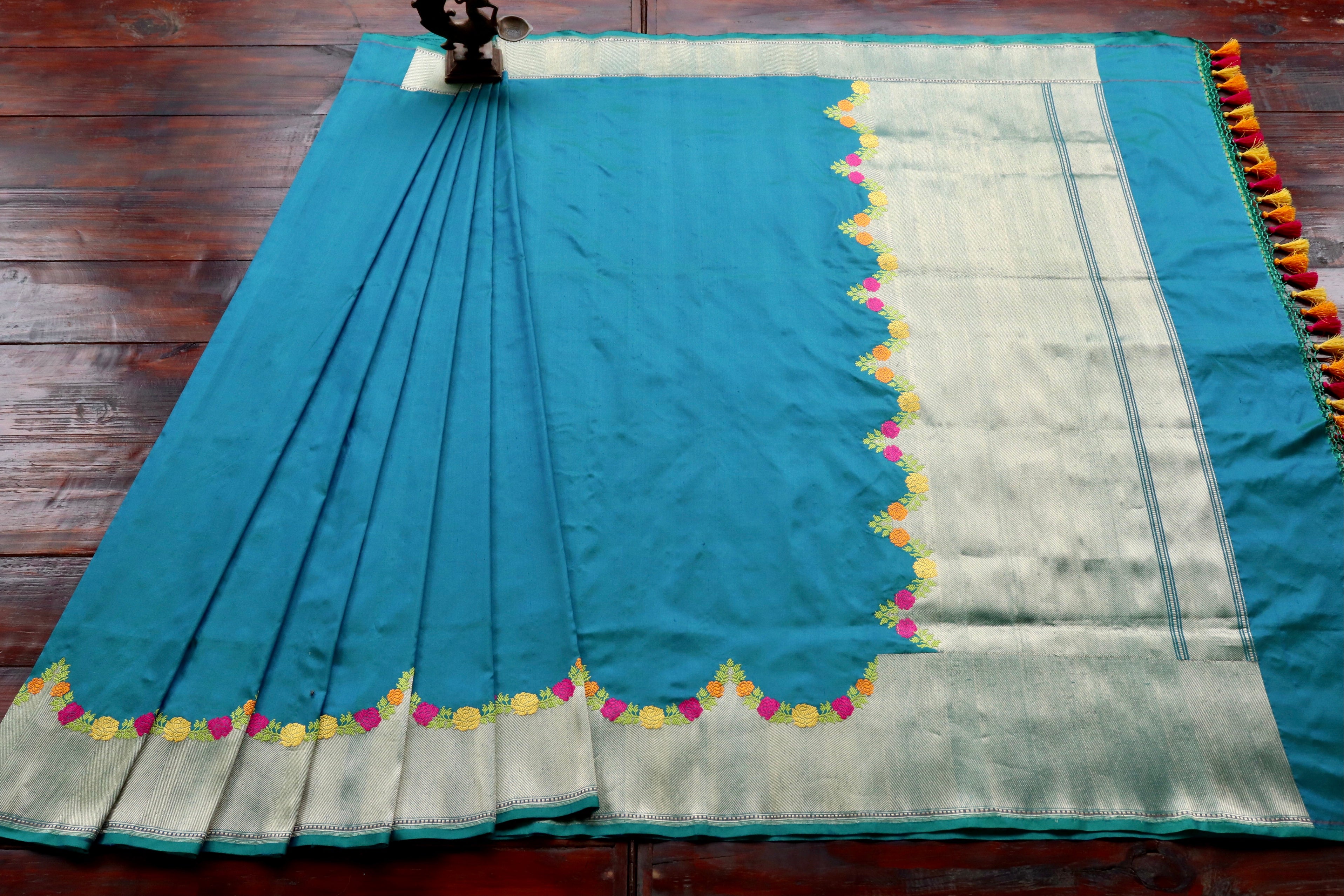 Peacock Blue Floral Border Pure Silk Handloom Banarasi Saree