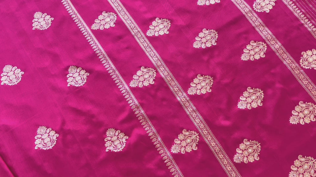 A Timeless Handwoven Banarasi Saree In A Gorgeous Colour Adorned With Beautifully Placed Sona Rupa Kadhua Motifs All Over Edged With An Intricate Floral Border And Elaborate Design Aanchal.